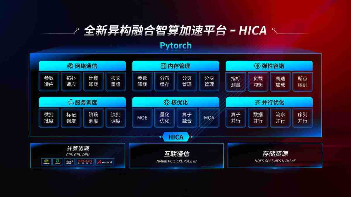 通过自研的服务层、、中间适配层、、、、以及调度编排算法,,,采用数据并行、、、、模型并行等多种并行方式,,把并行计算任务进行有效的分解,,,,使其分别由相应的软件栈和算力资源来承接。。。。当GPU资源变化,,,,HICA可以实时动态调度计算子任务并调整模型拓扑和架构,,以充分聚合各种算力资源。。。